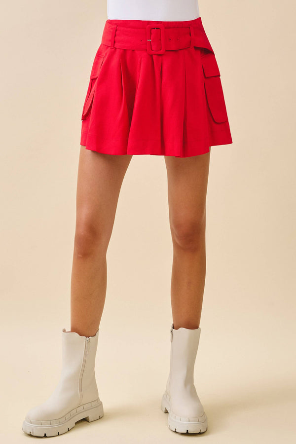 SALE-Wide Belt Pleated Detail Cargo Pockets Skirt-Red