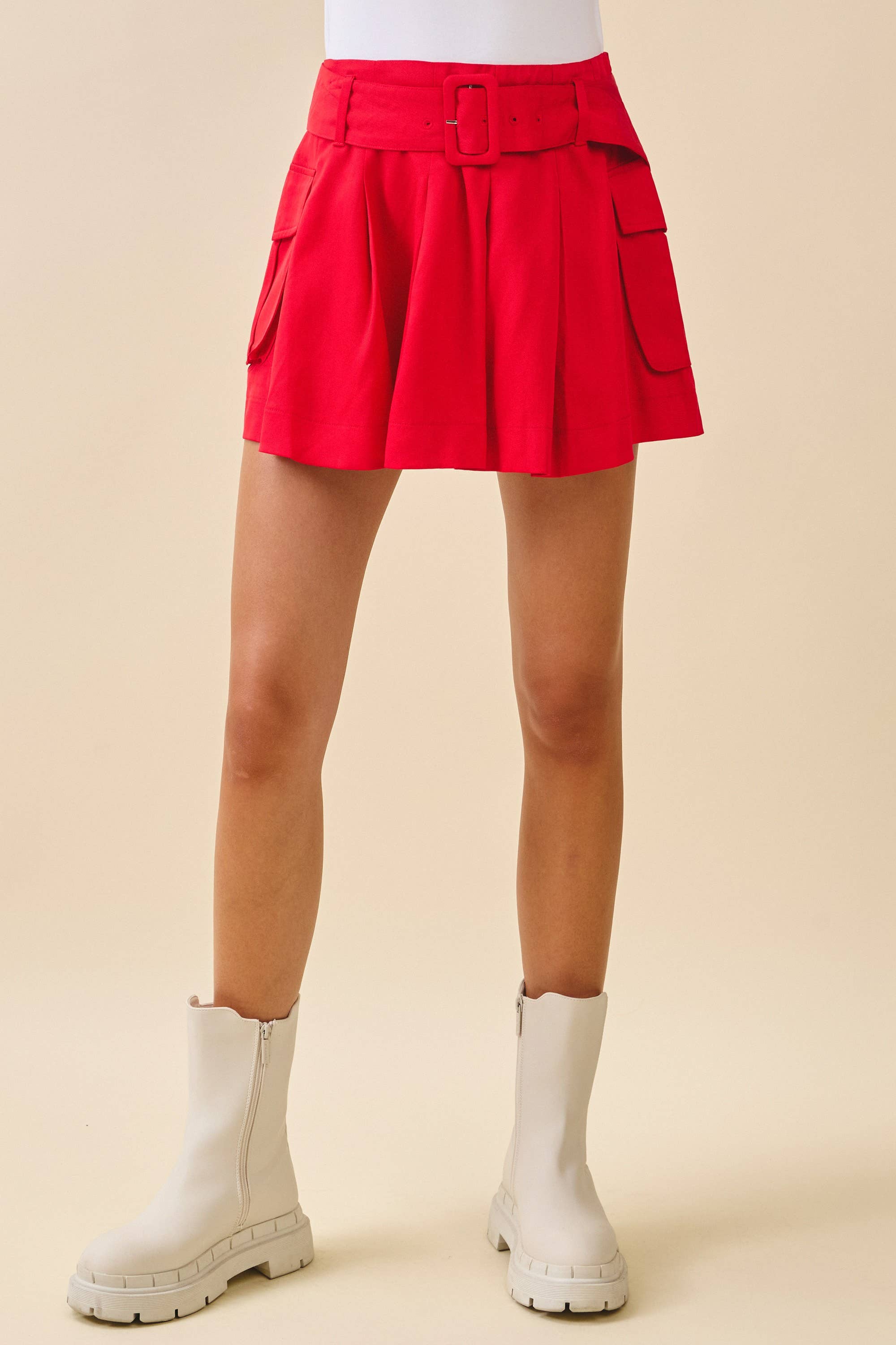 Shop the Pleated Red Skirt with Belt and Cargo Pockets at Simply Dixie Boutique for your next standout look.