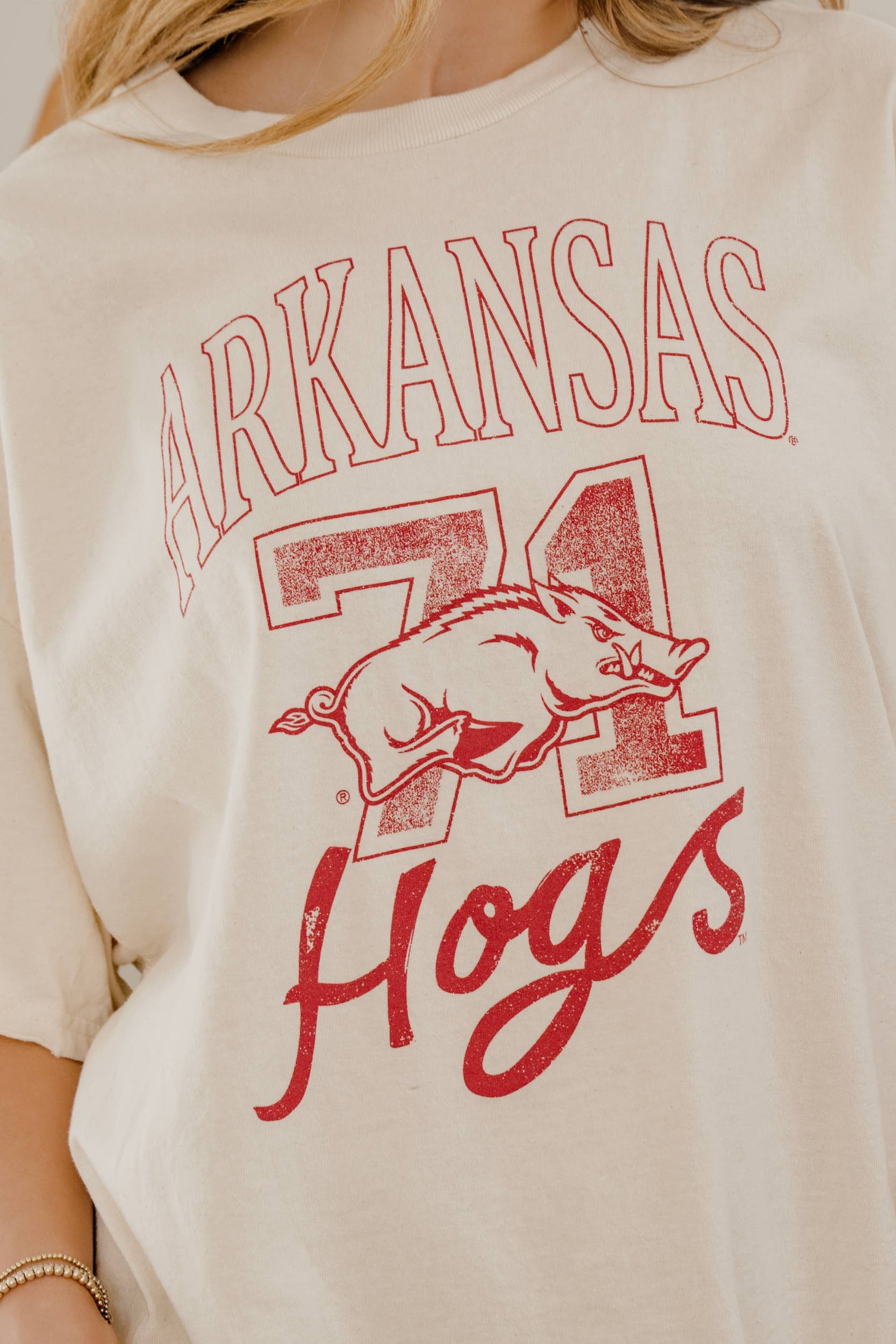 Cheer on the Hogs in retro style with the LivyLu Arkansas Razorbacks Club Mascot Thrifted Tee from Simply Dixie Boutique. πŸ— This vintage-inspired off-white tee delivers the perfect blend of comfort and team spirit, featuring a bold Razorbacks mascot graphic with a laid-back thrifted look.