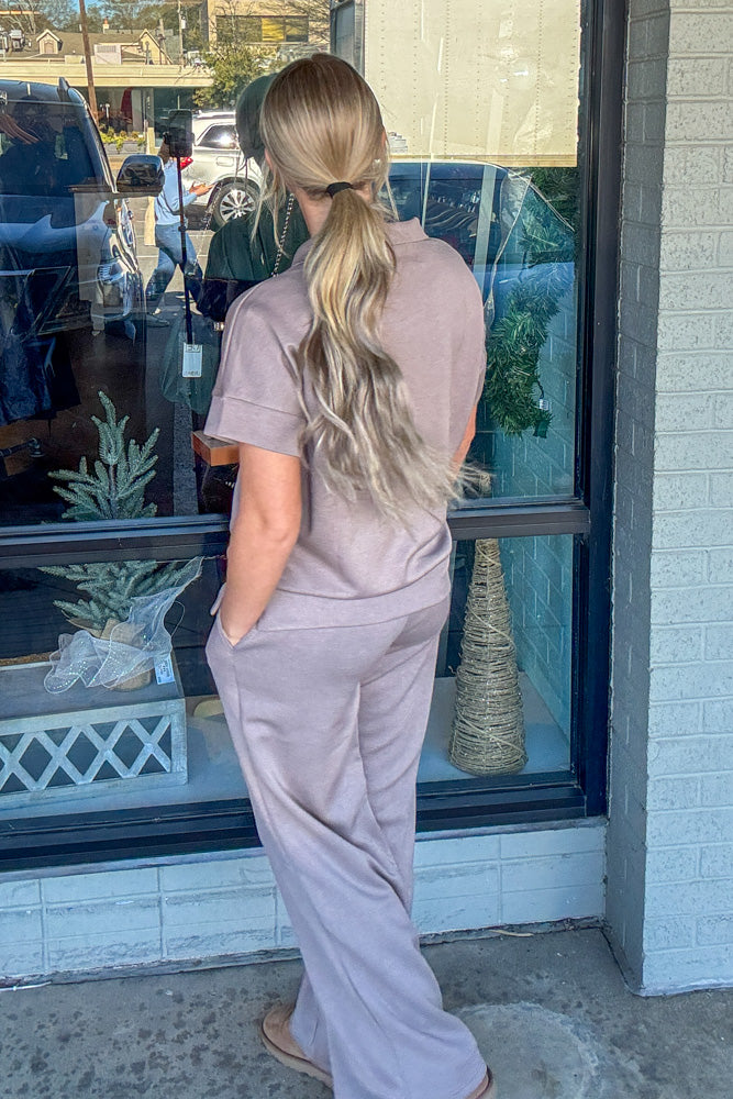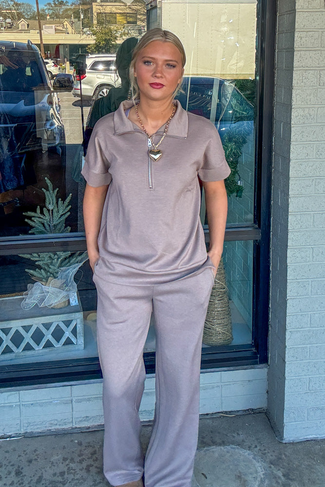 The half zip short sleeve top offers a clean, sporty-luxe look with a stand collar and modern silhouette. Paired with matching elastic-waist pants, this set creates a polished head-to-toe outfit that’s perfect for travel, errands, casual days out, or stylish lounging.