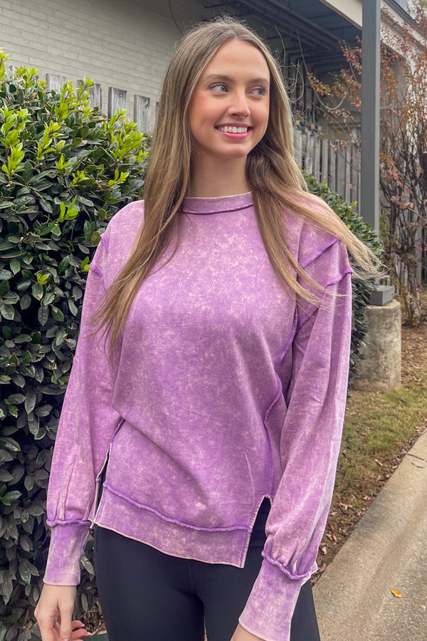Zenana- Acid Wash French Terry Exposed Seam Sweater