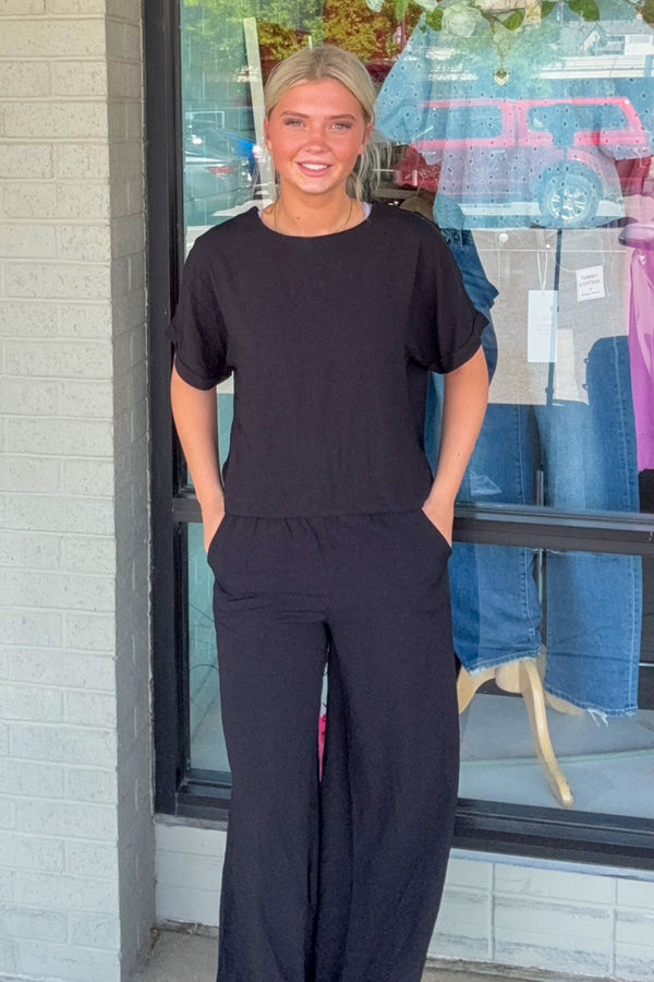 Zenana-Woven Short Sleeve Top and Pants Set-Black