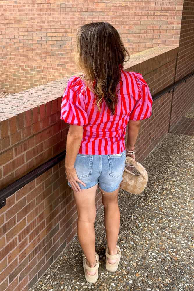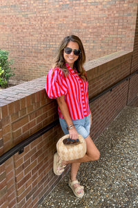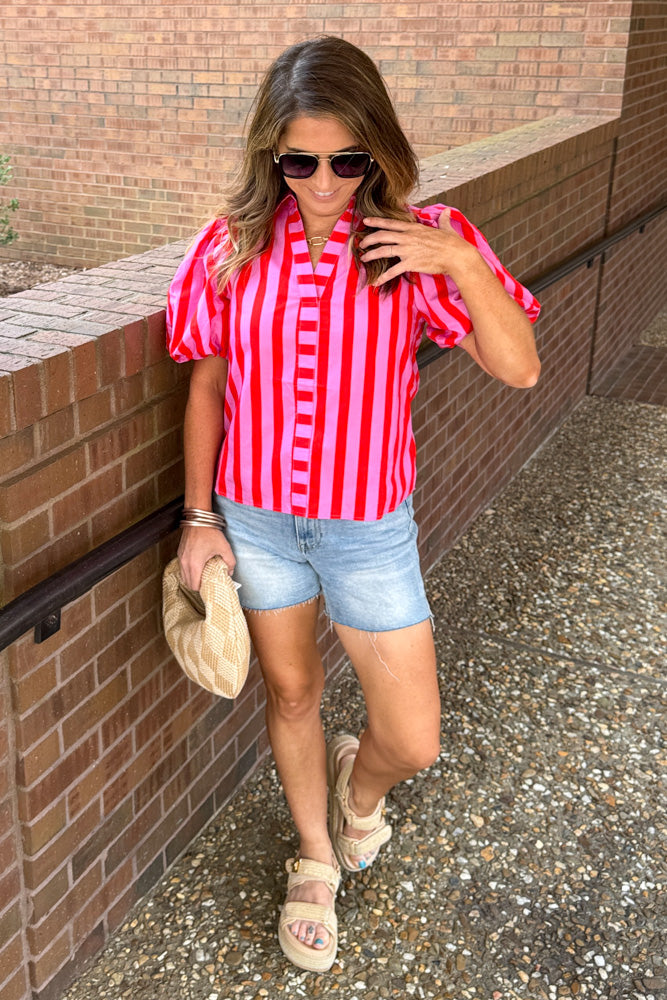 Bold color and playful charm come together in the Pinch Red and Pink Vertical Striped Top, exclusively at Simply Dixie Boutique. Featuring vibrant vertical stripes in rich red and soft pink, this statement-making top is designed to turn heads while keeping your look effortlessly polished.
